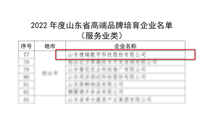 近日,山東省市場(chǎng)監(jiān)管局、省發(fā)展改革委、省委宣傳部聯(lián)合發(fā)布2022年度山東省高端品牌培育企業(yè)名單,捷瑞數(shù)字榮耀上榜(服務(wù)業(yè)類(lèi))。